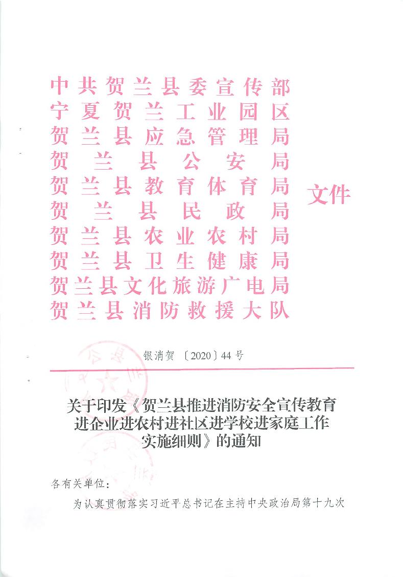 关于印发《贺兰县推进消防安全宣传教育进企业进农村进社区进学校进家庭工作实施细则》的通知