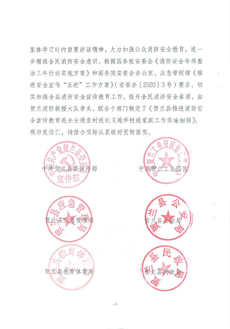 关于印发《贺兰县推进消防安全宣传教育进企业进农村进社区进学校进家庭工作实施细则》的通知.pdf
