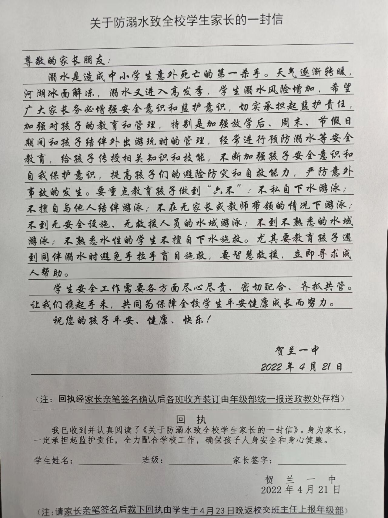 为切实做好学校防溺水工作,培养学生安全防范意识和自救自护能力,避免溺水事故的发生,贺兰一中开展防溺水专项治理活动。